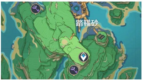 1、首先我们可以先从分布较为密集的地方开始寻找,在踏鞴砂地图下方的传送点降落,往传送点南方向走几步,在半山腰会看见一个,接着传送至踏鞴砂左上角的传送,在河对岸的半坡上可以发现第二个。