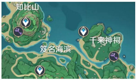 4、在鹤观的知比山传送点降落,往南方向的地方向下看即可看见一个,在千来神祠传送点传送,往东方一直走,在山顶上面可以看见一个。