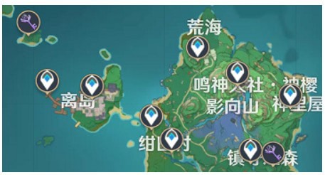6、在鸣神岛的离岛的码头降落,需要玩家们想北方的小岛游过去,在无名小岛的山顶上可以看见一个,最后一个在镇守之森传送点的东边山顶上面。