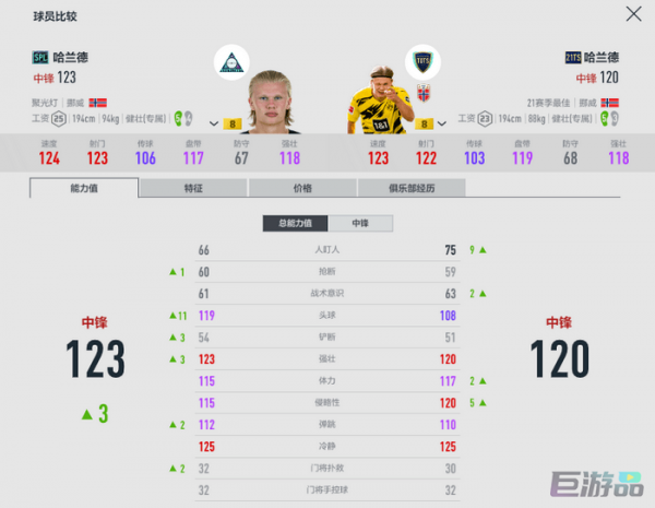 SPL哈兰德:这个哈兰德属性也是非常强了,对比21ts头球能力更出色,这个高大的模型,这样的中锋,头球不行,那不是很尴尬。更强壮,平衡更高,射门也更强。