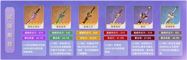 武器推荐目前[雾切]依然是最佳适配武器。对于刻晴的激化体系而言,[苍古]、[铁峰刺]此类提供精通的武器也是可以的。