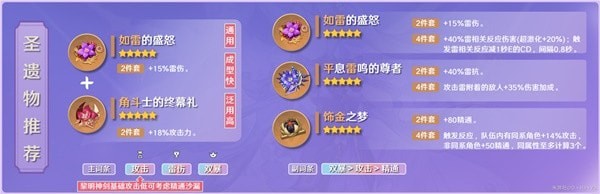 圣遗物推荐[2如雷+2角斗]易成型,且面对多样的环境或者多样的阵容搭配时,其泛用性就挺强。