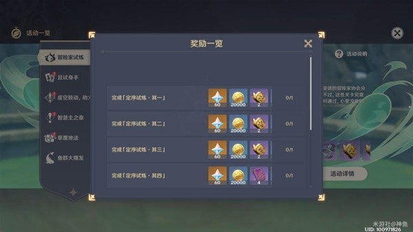 《原神》冒险家试炼第一天的关卡为定序试炼其一,包含三个挑战。下面请看由“神鱼”带来的《原神》3.2版冒险家试炼第一天攻略,希望对大家有用。