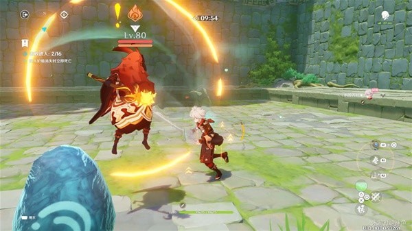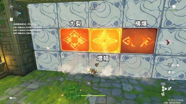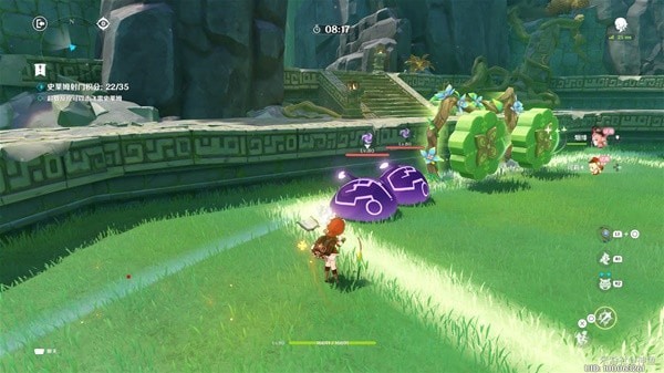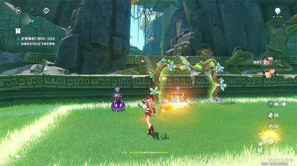 可莉或烟绯利用重击/普攻踢雷史莱姆(史莱姆不会攻击玩家) 将其射入「藤蔓球门」 获得积分(35分通关)