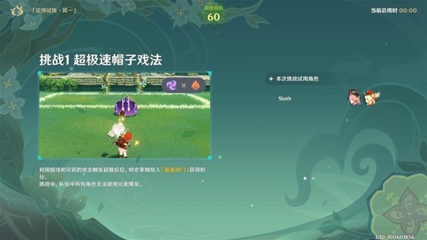 本关利用试用角色烟绯与可莉进行攻击触发超载反应,将史莱姆投入「藤蔓球门」获得积分,挑战中。队伍角色无法使用元素爆发