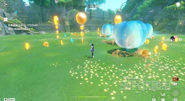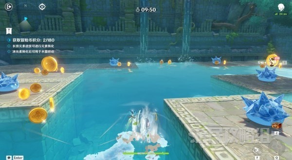 此挑战主要利用早柚的元素战技(长按)与冰史莱姆触发元素反应快速在水面上移动来拾取金币,小金币1分,大金币5分,累积获得180分可以完成挑战。长按早柚的元素战技并撞过冰史莱姆再移动到水面上会使水面冻结,如果使用元素战技后先触碰了水面再去触碰冰史莱姆的话就会先附着上水元素无法冻结水面,需要取消战技再重新使用。