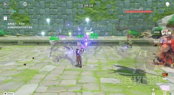 此挑战主要是利用草元素+雷元素反应来击败敌人,在战斗期间需要不断切换纳西妲和刻晴来触发元素反应,简而言之就是注意敌人头上有草元素标记就切换刻晴,有雷元素标记就切换纳西妲。