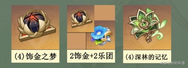 4饰金之梦(230点精通)和2饰金+2乐团(160点精通),都是增加精通,4饰金虽然比散搭精通高很多,但首次元素反应只能吃到80点精通,而且队伍角色限制大,泛用性很低,总的来说,都差不多,不过优先散搭,因为泛用性高;