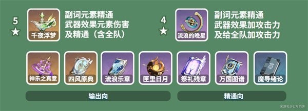 6.流浪的晚星:副词精通,无效效果基于元素精通一定比例加攻击力(5精加480),并给全队加攻击力(5精144)。算是4星里最适合纳西妲的武器了,输出期望与流浪乐章几乎无差距。缺点是这是限定武器,需要up才能抽到,还没保底,满精不比5星难度低多少。