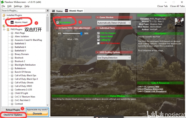 点击左下角检查更新,并等待更新完、双击打开原子之心插件(记得更新完把Fix Enabled勾上)