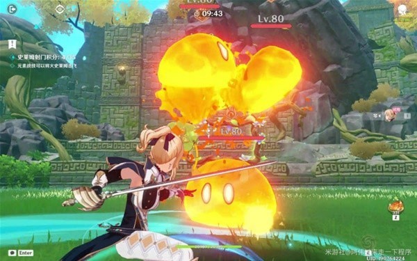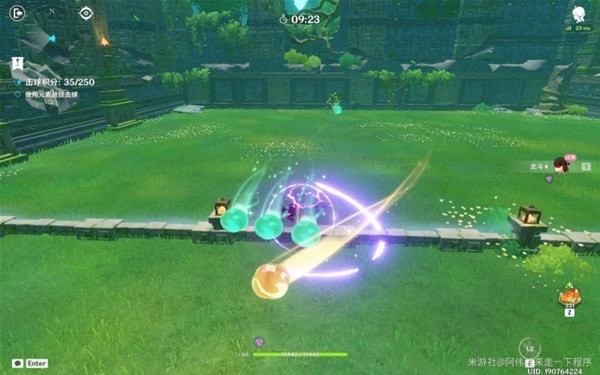 使用神里绫华的天赋技能代替冲刺在水面移动以获取金币。小心脏脏弹,被击中会遮挡视野。没体力了可以通过获取场上的光点来恢复。