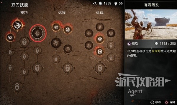 初期在冰天雪地里,血条带冰冻的敌人较多,更多的是用双刀战斗,所以建议优先点双刀的技能。
