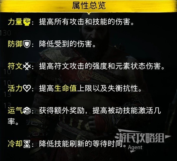 《战神诸神黄昏》中奎爷有六种属性:力量、防御、符文、活力、冷却、运气,这些属性具体有哪些效果呢,这里为大家介绍下。