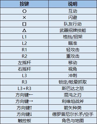 ·暴怒模式,同时按下L3+R3进入怒气爆发状态,使用L1、L2、R1、R2都可以攻击敌人(无视霸体,必定能对敌人造成硬直),每次攻击恢复奎托斯少量生命值,受到伤害不会减少生命值而会减少怒气值,再次按下L3+R3或怒气值为0时,退出暴怒状态;