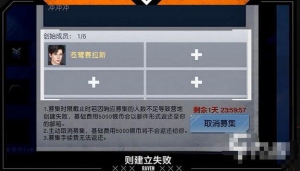 3、在规定的时间内,还没筹齐人数的就算创建失败,会将基础费用五千银币以邮件的方式返还给你,要是主动取消就不会返还,玩家可以提前约好伙伴,能够大大提高创建营地的成功率。