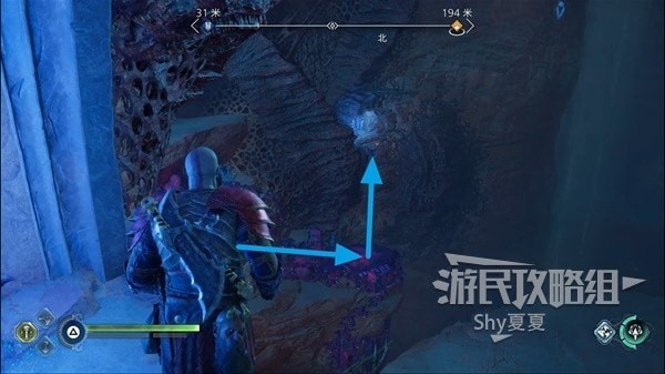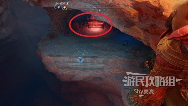 下来之后,向右走,沿着箭头上去可以拾取一个宝箱。