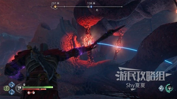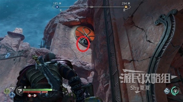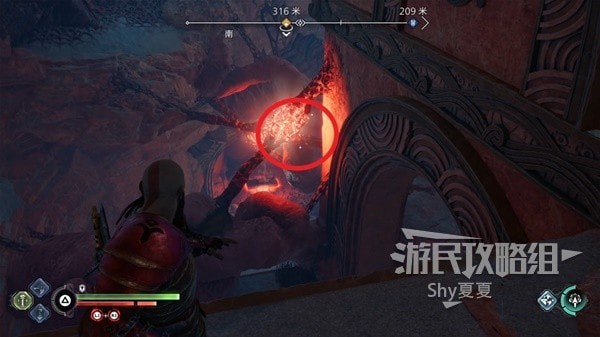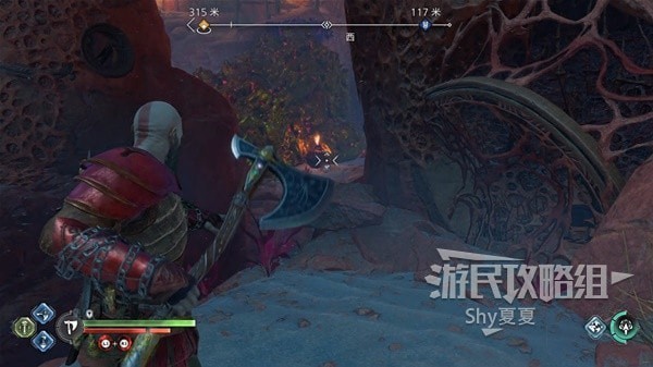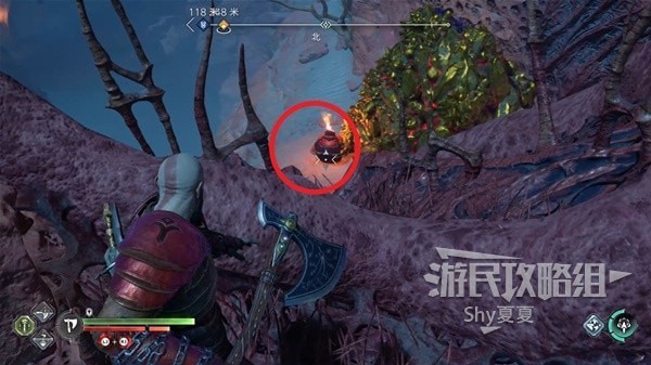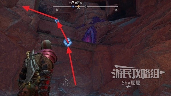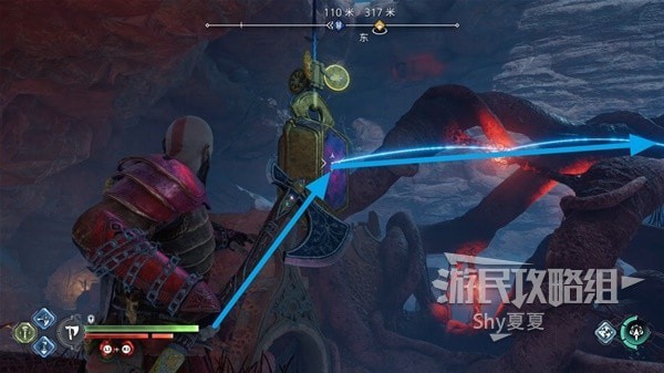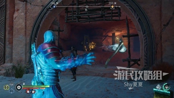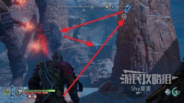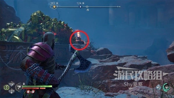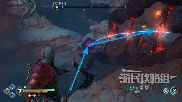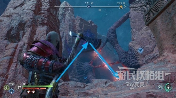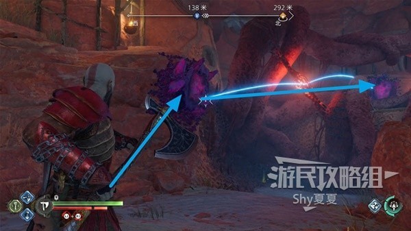接下来往前走会遇到自爆小妖,然后来到下图位置,需要站在图中位置投掷斧子,就能打开通路。