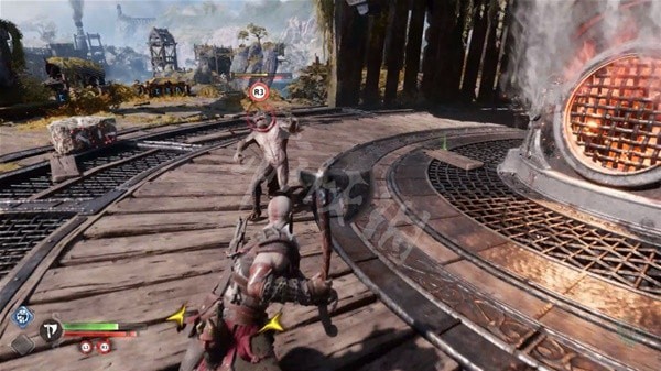 奎托斯会自动将屏幕上的一名近身敌人作为目标。移动可以改变奎托斯的目标。
