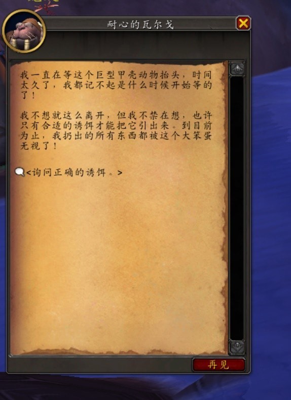 巨壳可汗无法被攻击,询问旁边的海象人耐心的瓦尔戈可以得知需要合适的诱饵才能把它引诱出来。