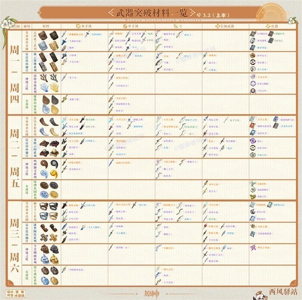 《原神》角色和武器需要的突破材料各不相同,想要知道全部角色武器素材需求的话请看下面“墨小菊ぃ”带来的《原神》3.2版全角色及武器突破材料表,希望能够帮助大家。武器新增:「法器·千夜浮梦」角色新增:「法器·纳西妲」天赋突破材料一览武器突破材料