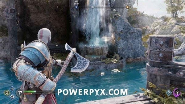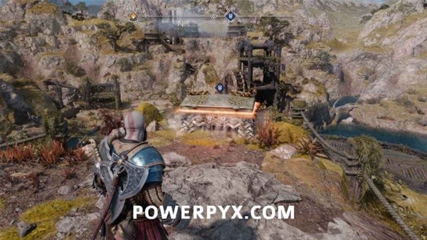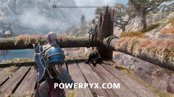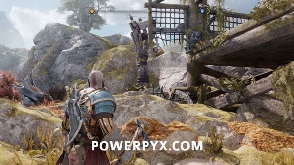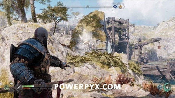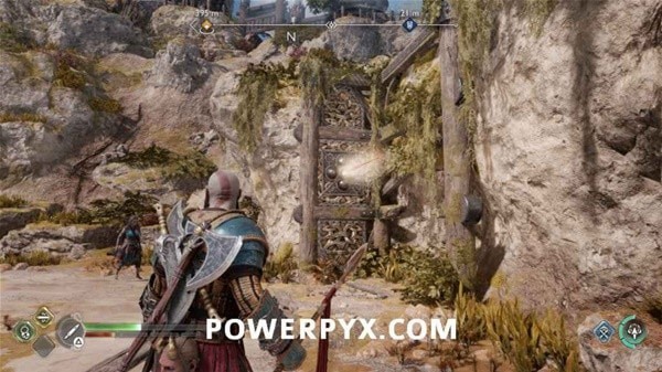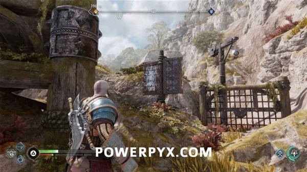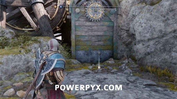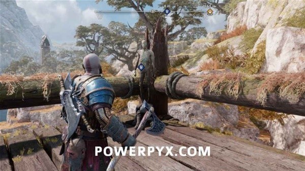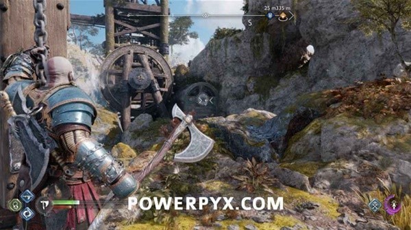 转身用长矛打爆岩石,然后来到另一侧拉动铁链,冻住远处的齿轮。回到之前有世界之树裂隙的平台上,用斧子冻住间歇泉,摆荡过去后收回斧子,乘坐升降梯向上。