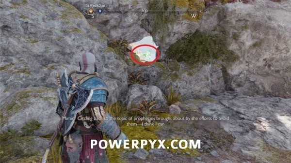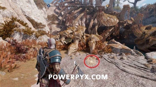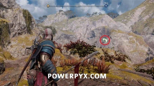 右拐往前走,打碎左手边的石头,然后打掉在天上盘旋的奥丁渡鸦,右拐往下看,用长矛打爆远处的岩石。