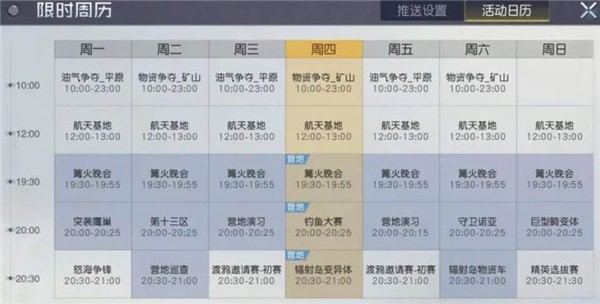 6、周六:物资争夺-矿山、航天基地、篝火晚会、守卫诺亚、辐射岛物资车。