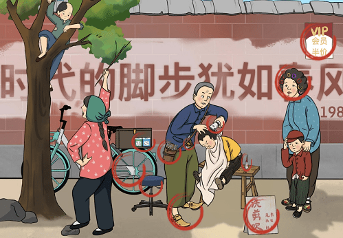后面的车子上面有【二维码】,还有共享单车,老爷爷腰上面是【工具包】还有【腰带】,手上是【推子】,旁边的凳子上面有【胶水】,右上角有【广告】,右边的老奶奶头上是【卷发筒】,老爷爷脚上是【切尔西】,旁边是【旋转椅】,红色衣服的小男孩手腕上是【电话手表】。