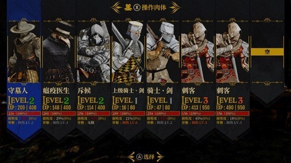 盗贼头目,瘟疫医生,斥候,(此后为二周目方可解锁)疯骑士,囚徒骑士,十字枪骑士