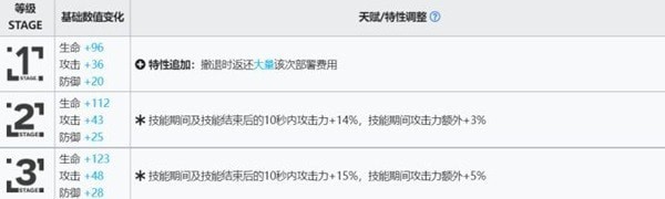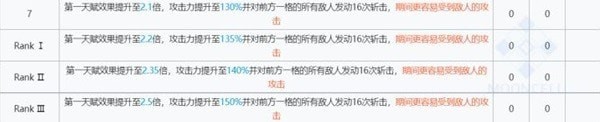 落地立即进行快速的16连击,攻击力提升至一定百分比、第一天赋效果提升、对面前一格造成真群攻效果,且这5秒内本体嘲讽值+1