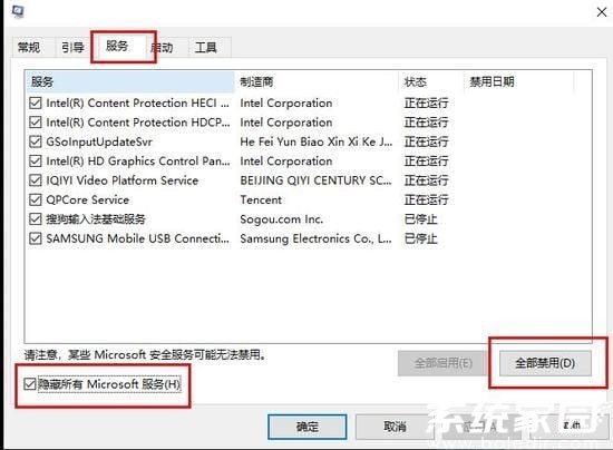 2、点击“服务”勾选“隐藏所有Microsoft服务”点击“全部禁用”。