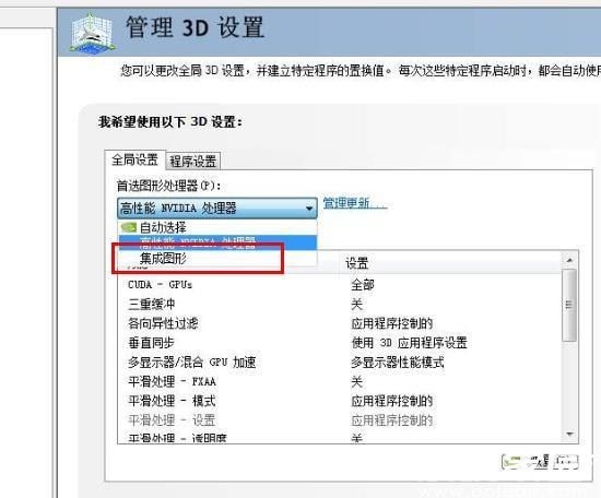 3、在全局设置中点击“首选图形处理器”的下拉,选择“集成图形”即可。