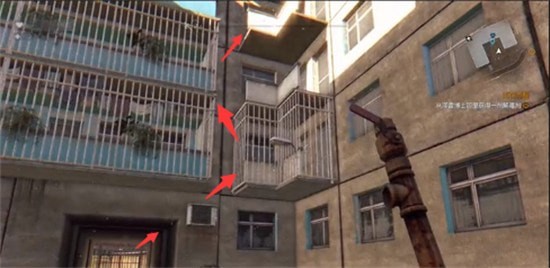 4、然后往对面的栏杆爬去,到走廊之后,按照下图标记移动。