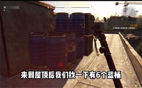 6、来到楼顶之后,找到顶楼一堆蓝色桶位置,如下图。