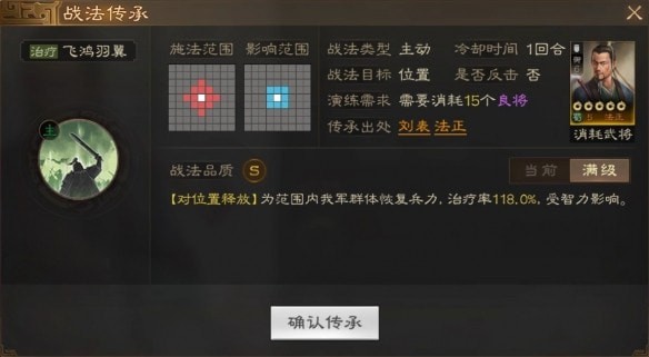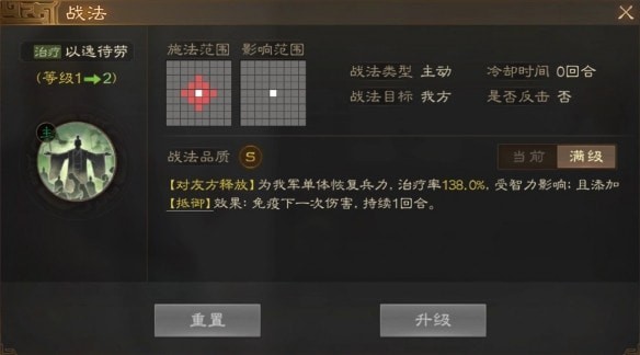 为我军单体恢复兵力,治疗率63%~126%,受智力影响;且添加【抵御】效果:免疫下一次伤害,持续1回合,0回合冷却时间