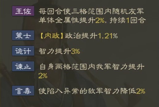 王佐:每回合使三格范围内随机友军单体全属性提升2%,持续1回合