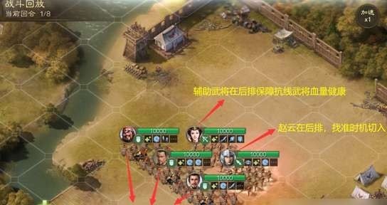 辅助武将站在后排,确保我方抗伤坦克武将的血量健康。