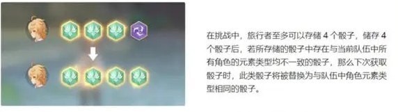 3、在挑战中,旅行者至多可以存储子,储存4 个骰子后,若所存储的骰子中存在与当前队伍中所有角色的元素类型均不一致的骰子,那么下次获取为与队伍中角色元素类骰子时,此类骰子将被替换为与队伍中角色元素类型相同的骰子。
