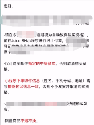 1、玩家可以前往Juice SH小程序进行线上付款,仅可购买邮件指定的中签款式,否则取消购买资格;