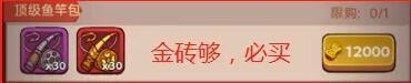 12000金砖换30金鱼竿和30银鱼竿,在普通的黑市中30金鱼竿就要12000金砖了,这里还多送30银鱼竿,是非常划算的。购买后的金鱼竿需要规划好使用,需要完成一轮的月度活动再使用,才能性价比最高。只要我们的金砖够,我们就必买。