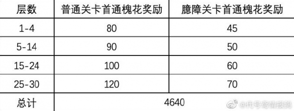 ◆首通奖励(普通+臆障):30层共可拿槐花:4640,具体每层可拿数量看P1