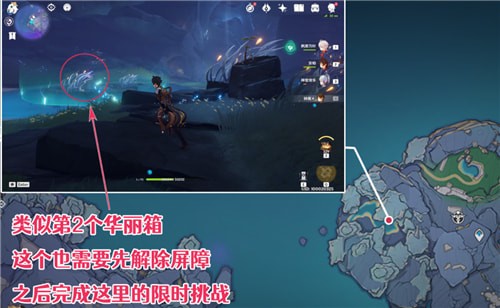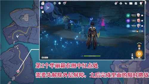 解密方式:和第二个华丽宝箱类似,都是需要先找到三个仙灵解开屏障,仙灵位置如下。