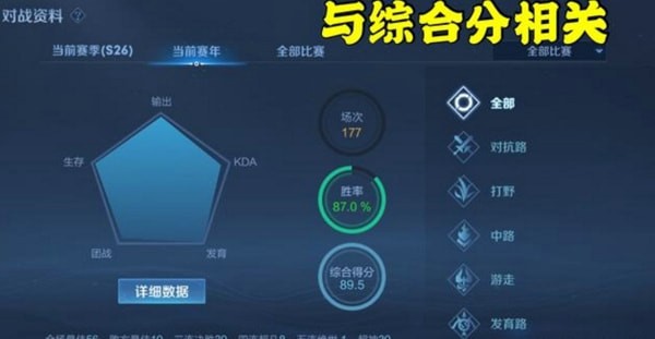 综合评分与胜率、系统连胜或连跪、匹配队友都存在关系,评分越低上分也就越困难