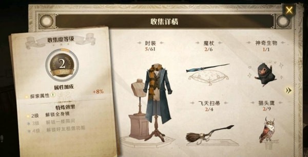 玩家的收藏是要达到四级才可以共享衣服,这个收藏室就是玩家游戏界面右下角那个【巫师】中的级别,玩家获取的时装、魔杖、扫帚越多,收藏室的等级越高,二级开镜子,三级开楼,四级就可以开放租借的功能。