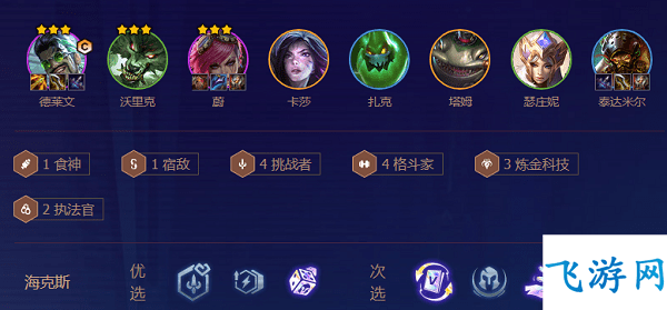 2、阵容羁绊:4挑战者4格斗家3炼金科技2执法官1食神1宿敌