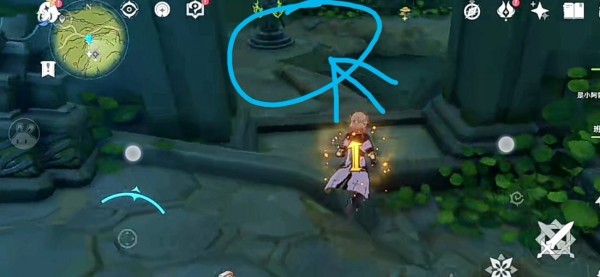 往遗迹相反的方向走,在墙边可以看见一块石头,利用草种子进行草元素攻击后出现第三个元素方碑。